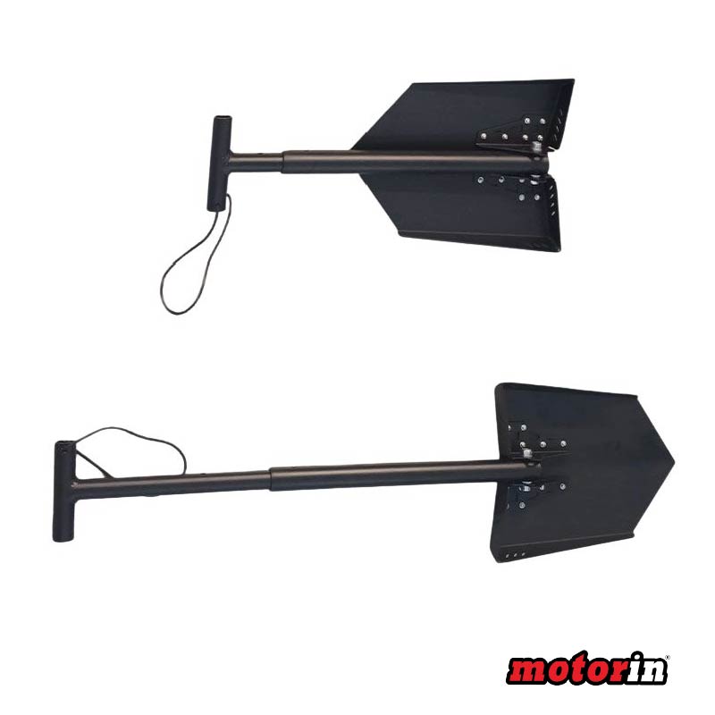 Pá pequena em alumínio 100%, soldada a TIG, pensada para quem procura um acessório funcional, durável e fácil de transportar em viagens off-road, overland ou expedições.