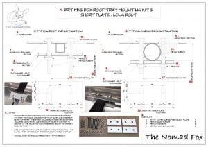 5 – Notas: O Kit de montagem da bandeja 2 é para sistemas de suporte com largura máxima de 36 mm e altura máxima de 43 mm. Normalmente, são barras de tejadilho e tubos de carga da barra basculante, incluindo racks, se você preferir ancorar no nível dos suportes secundários sob as ripas principais. Deve-se tomar cuidado ao apertar os parafusos com força excessiva, pois eles podem entortar a bandeja de alumínio. Você precisará de uma chave Allen H5 e uma chave de 13 mm.