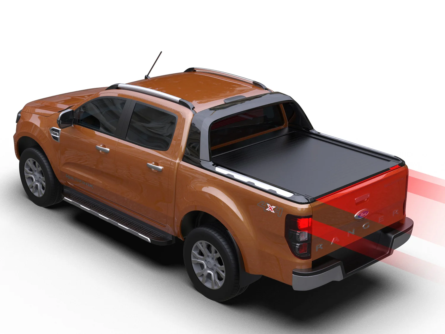 Aumente a segurança e a visibilidade com o sistema elétrico integrado e avançado do Tessera Roll+. A barra de luz LED vermelha funciona como luz de travão e luz de presença. A faixa de LED branca dinâmica de comprimento total, posicionada de maneira única na lâmina móvel, move-se em sincronia com a cobertura retrátil, proporcionando uma iluminação consistente e completa à noite, mesmo quando totalmente carregada.
