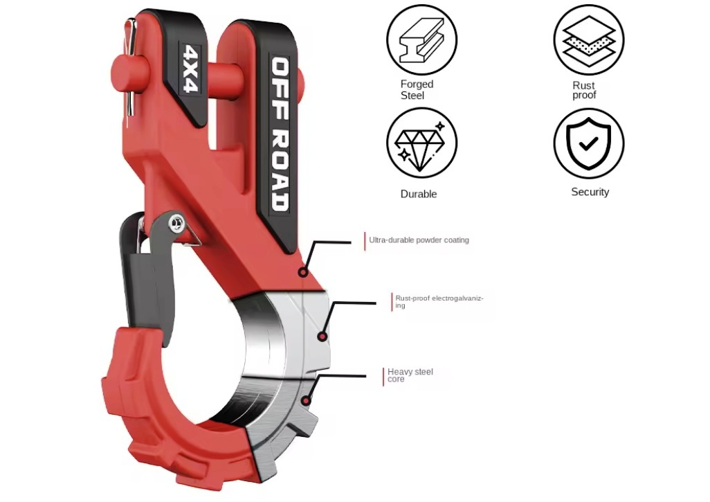 Compatível com cabos de aço ou sintéticos até 14 mm, o design amplo permite instalar facilmente uma grelha ou grampo de grande dimensão, tornando-o versátil para qualquer tipo de recuperação ou reboque 4×4.