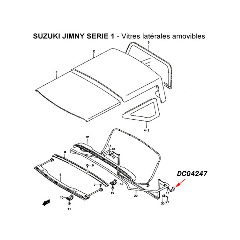 Este componente permite a ligação entre a parte lateral esquerda e a secção traseira da capota no Suzuki Jimny MK1, sendo indispensável em determinadas conversões.
