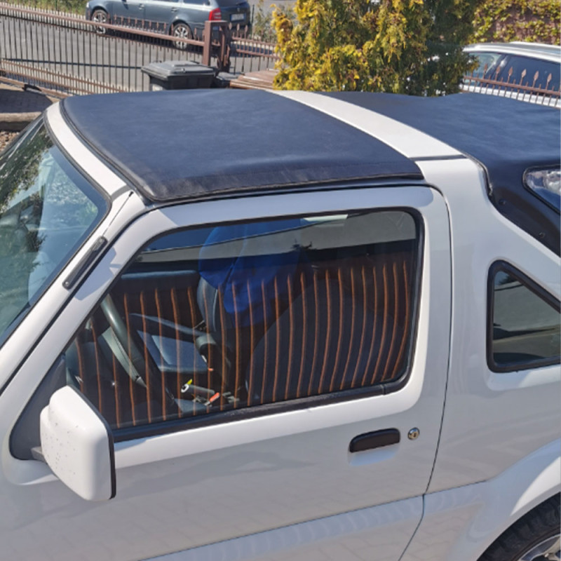 Capota em lona PVC (vinil com acabamento grão de couro mate), desenvolvida para oferecer maior conforto e durabilidade, ideal para renovar o teu Suzuki Jimny Cabrio com qualidade superior ao original.